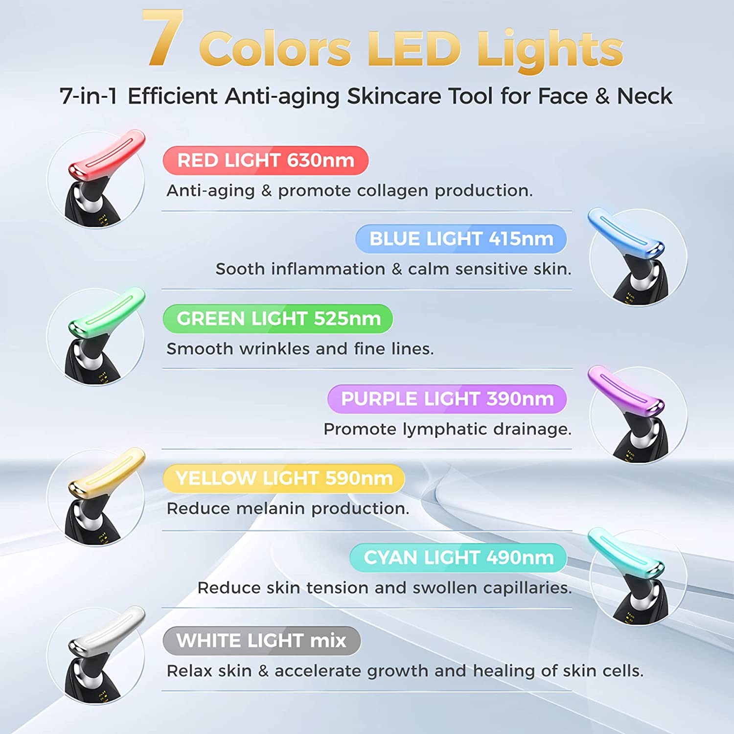 - 7 krāsu LED gaismas ar vairākām funkcijām