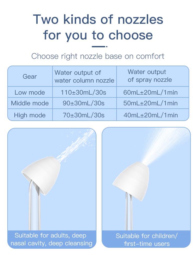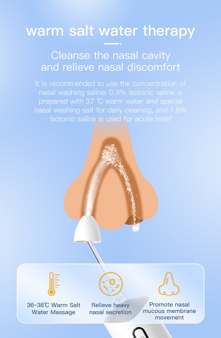 【Par 90 grādos rotējošie uzgaļi】 Deguna tīrīšanas līdzekļa 360 grādos rotējošā uzgaļa dizains ir efektīvāks nekā Neti pods vai citas deguna skalošanas ierīces. Ar IPX7 ūdensnecaurlaidīgu dizainu deguna skalošanas līdzeklis ļauj izskalot visu ķermeni ar ūdeni, ko ir vieglāk tīrīt un kopt deguna dobumu. |