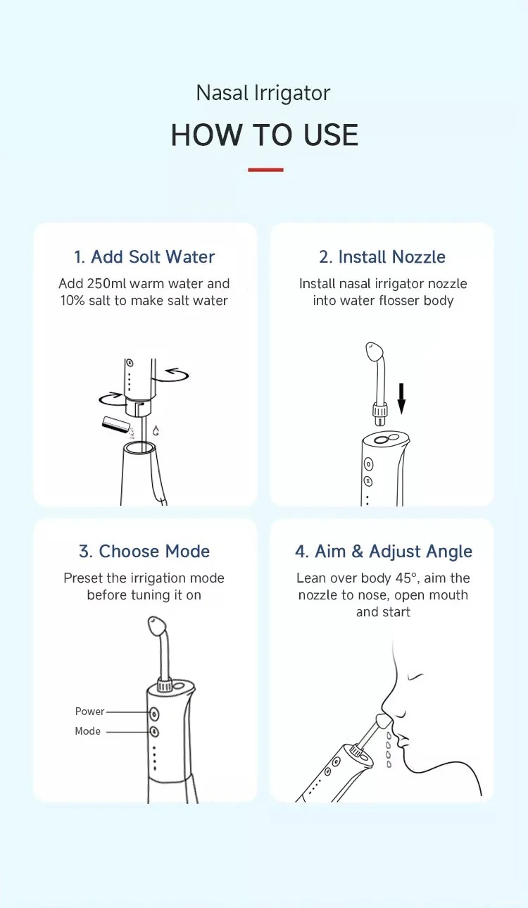 【Par 90 grādu rotējošiem uzgaļiem】 Deguna tīrīšanas līdzekļa 90 grādu rotējošā uzgaļa dizains ir efektīvāks nekā Neti pods vai citas deguna skalošanas ierīces. Ar IPX7 ūdensnecaurlaidīgu dizainu deguna skalošanas līdzeklis ļauj izskalot visu ķermeni ar ūdeni, ko ir vieglāk tīrīt un kopt deguna dobumu.