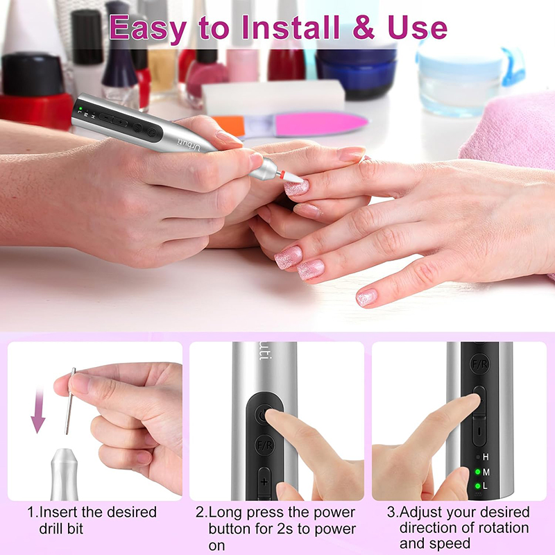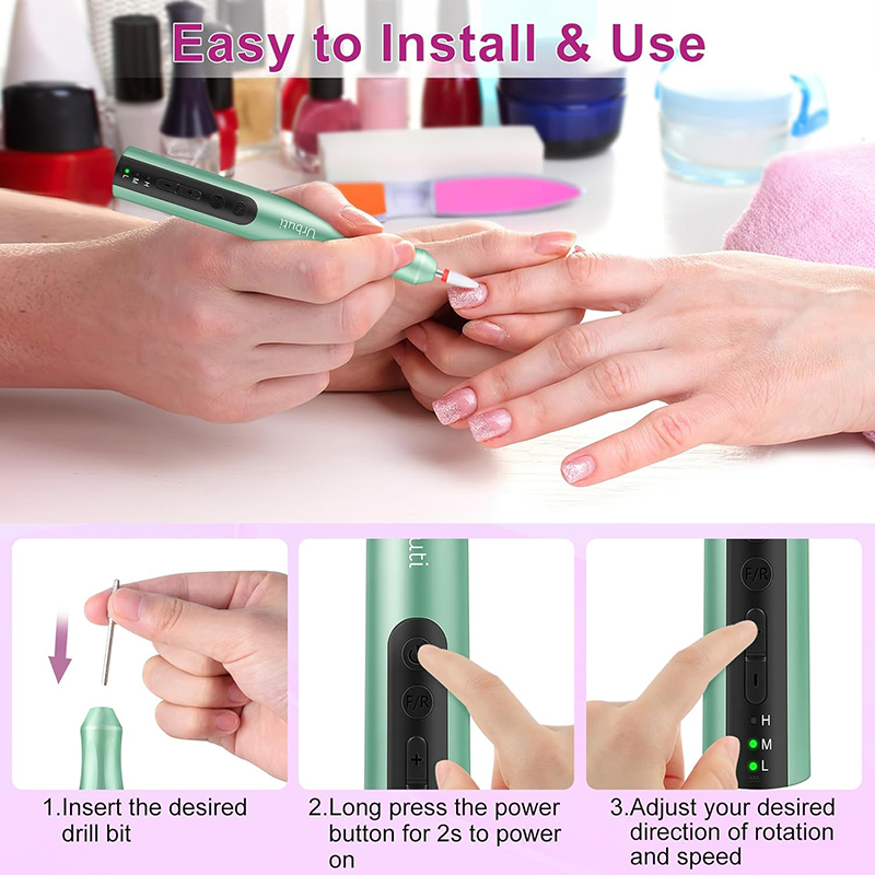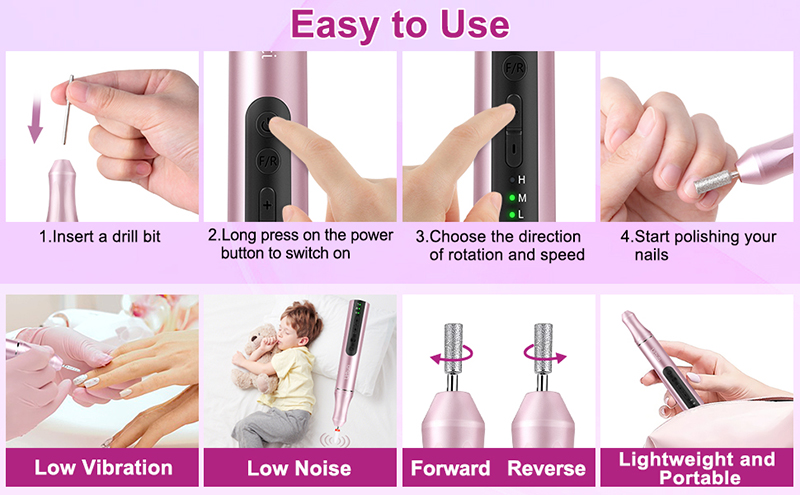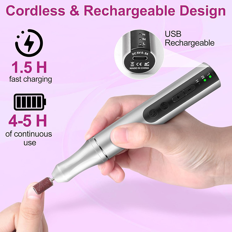 Šai elektriskajai nagu urbjmašīnai ir jaunākais alumīnija korpuss ar pretvibrācijas dizainu, kas var efektīvi samazināt troksni un karstumu, slīpējot nagus, nodrošinot, ka jūs nevienu netraucēsiet, pulējot nagus. Ergonomiskā pildspalvas forma nodrošina ērtu, neslīdošu satvērienu un ļauj viegli noņemt gēla nagus.