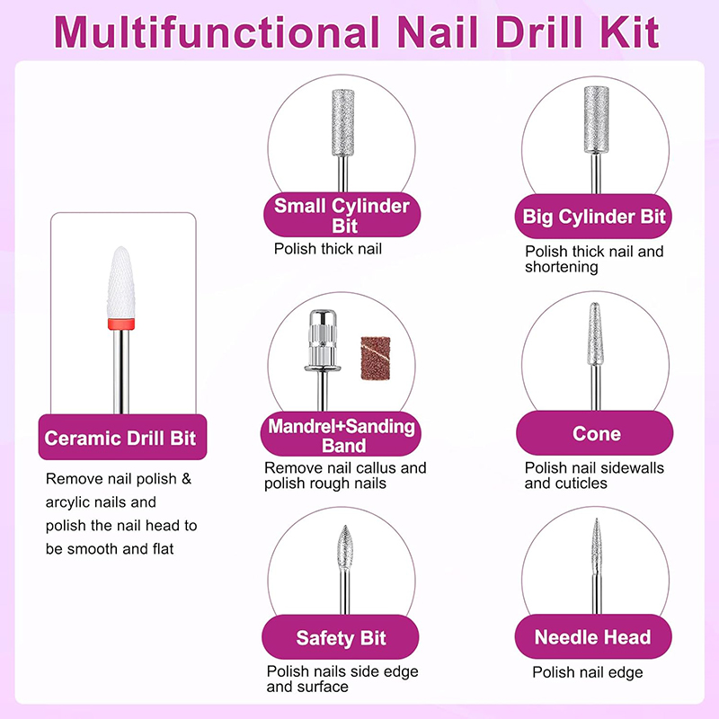 Akumulatora nagu urbjmašīnu komplekts piedāvā daudzas abrazīvās lentes un dažādus urbjmašīnus, lai izvēlētos piemērotāko dažāda veida naglām. Lai nomainītu sējmašīnu, vienkārši izvelciet to, nomainiet to ar vajadzīgo urbi un nospiediet ieslēgšanas/izslēgšanas pogu, lai to izmantotu, padarot to par ideālu dāvanu savām draudzenēm. Ja jums ir kādi jautājumi par šo produktu, lūdzu, sazinieties ar mums.