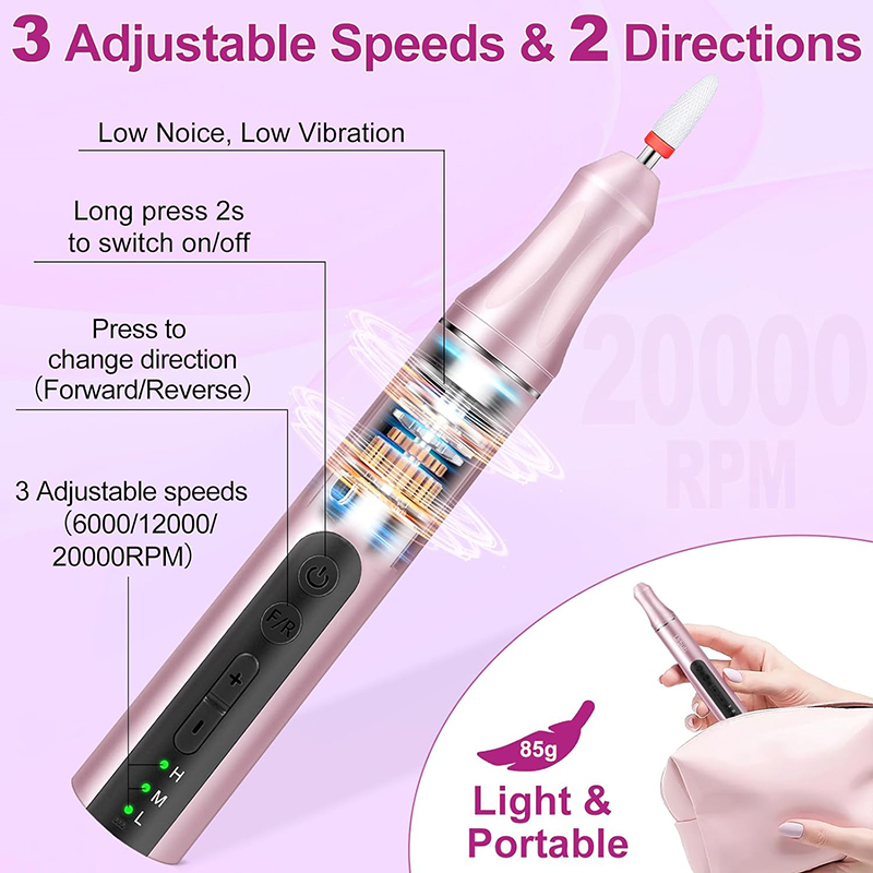Nagu vīles Professional ir izstrādātas ar 3 ātrumiem 6000-12000-20000, vienkārši nospiediet pogu + vai -, lai palielinātu vai samazinātu ātrumu. Viegli regulēt ātrumu un ietaupīt laiku, asinot nagus. Urbja virzienu var viegli mainīt, nospiežot F/R pogu, ideāli piemērots kreiļiem, meistariem nagu māksliniekiem vai iesācējiem nagu kopšanā.