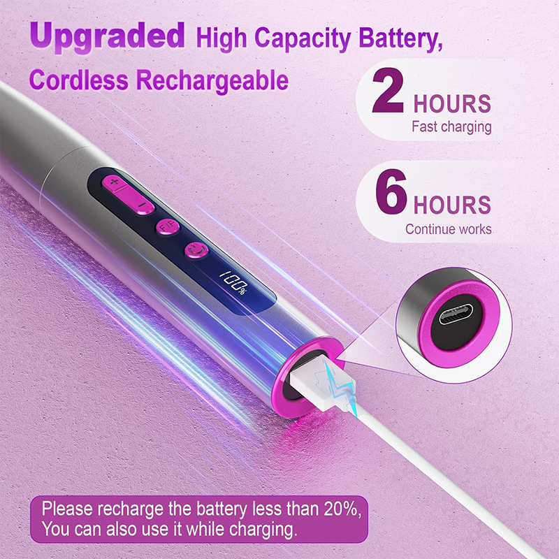 elektriskā nagu urbjmašīna Uzlabots augstas kapacitātes akumulators, 2 stundas Ātra uzlāde un 6 stundas Turpiniet darbu. Elektriskā nagu vīle ir piemērota jūsu USB strāvas adapterim, klēpjdatoram, mobilajai strāvai utt. Ja bezvadu nagu urbjmašīnas jauda ir mazāka par 20%, varat to izmantot arī uzlādes laikā.