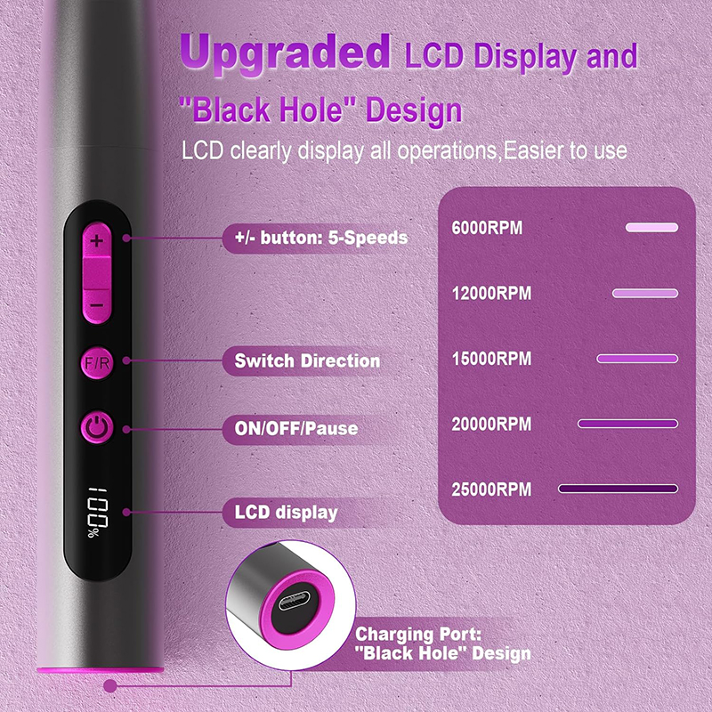Alumīnija sakausējuma korpuss ar augstas kvalitātes motoru, profesionālu naglu urbju ātrgaitas rotāciju un efektīvu siltuma izkliedi vienlaikus. Augsta koncentriskuma motors, spēcīga un vienmērīga jauda, nepārtraukta zema vibrācija, zems troksnis un zems karstums, padarot jūsu nagu kopšanu efektīvāku un ērtāku.