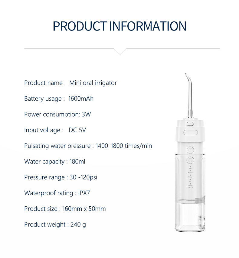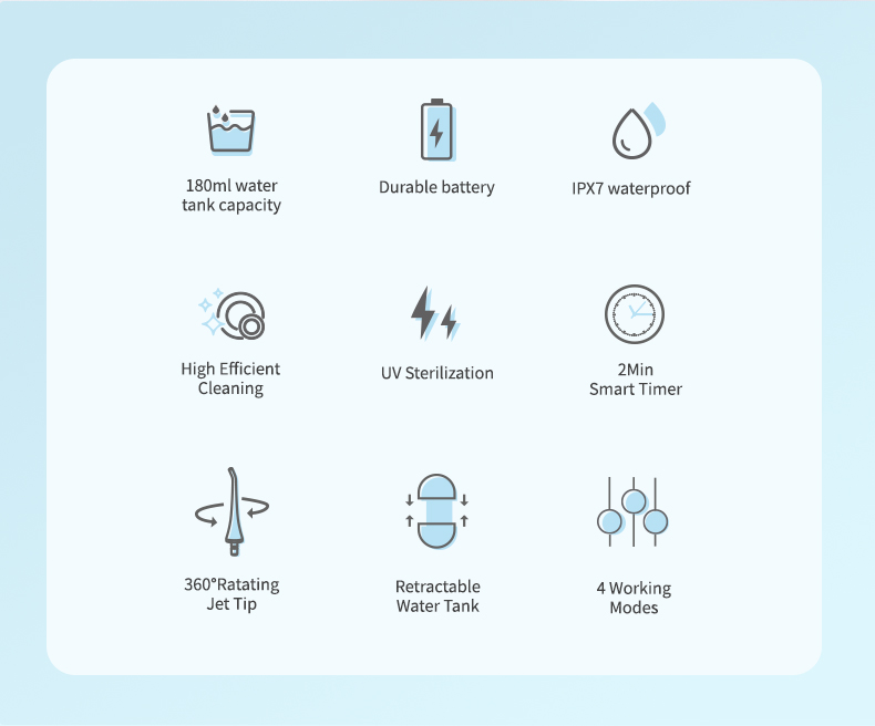 Šis ūdens diegs nodrošina augsta ūdens spiediena impulsus 1400-1800 reižu minūtē, efektīvi noņemot 99,9% zobu aplikuma dziļai zobu tīrīšanai. Šis ūdens diegs masē smaganas, veicina asinsriti un novērš mutes problēmas, piemēram, sliktu elpu, ortodontiskos zobus.