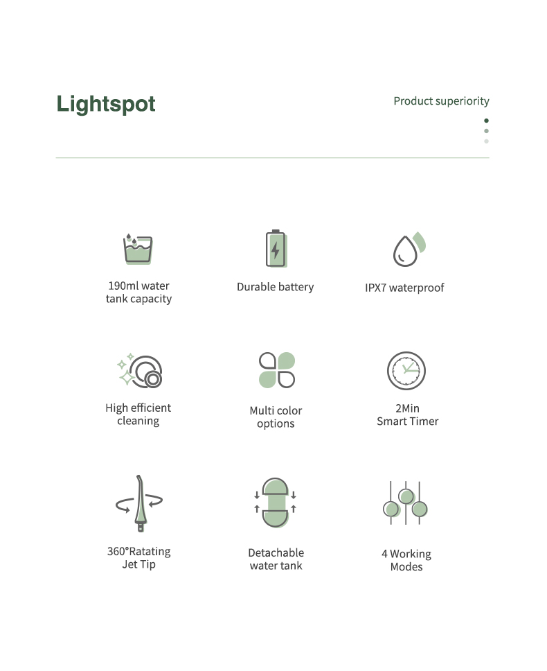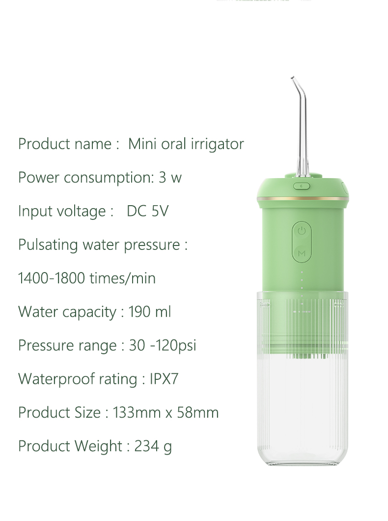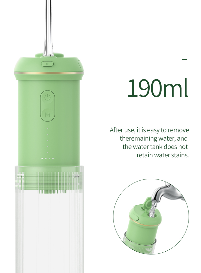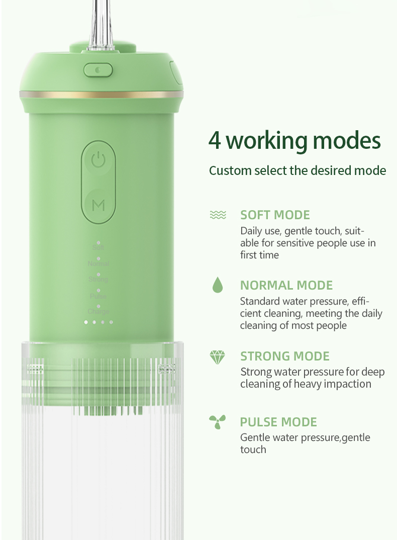Dziļa tīrīšana ar spēcīgu spiedienu: ūdens diegs izmanto jaunāko impulsu metodi, lai piedāvātu 4 režīmus ar spiediena diapazonu no 30-90 Psi un pulsa ātrumu 1400-1800 reizes minūtē, lai piedāvātu augstas intensitātes ūdeni, kas attīra 99,99% zobu celms, īpaši paredzēts periodontīta ārstēšanai, breketes.