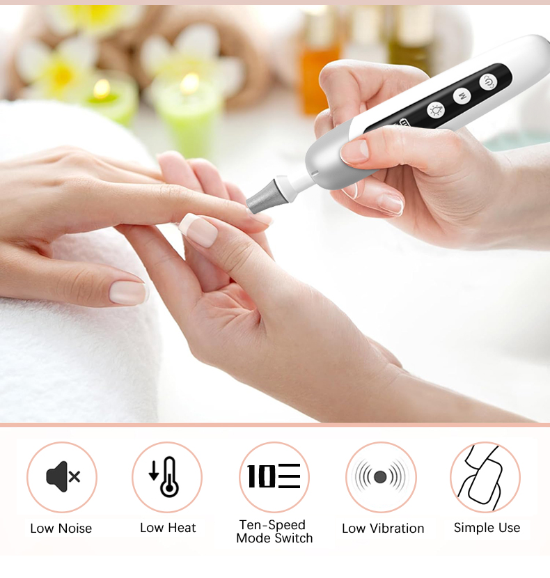 - 10 ĀTRUMA IESTATĪJUMI: izbaudiet mūsu elektriskā manikīra komplekta jaudu, kurā ir 10 progresīvi ātruma iestatījumi un daudzpusīgas rotācijas pulksteņrādītāja virzienā un pretēji pulksteņrādītāja virzienam. Nagu urbjmašīna garantē precīzu vīlēšanu uz bieziem roku un kāju nagiem un ir pielāgota visiem ādas tipiem, arī cilvēkiem ar cukura diabētu