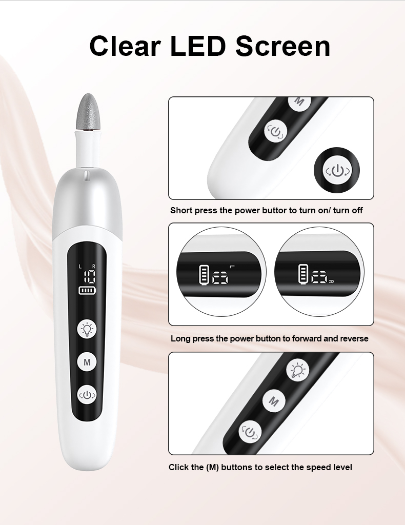 - INOVATĪVS LED DISPLAY: nemanāmi pārvietojieties vajadzīgajos iestatījumos un viegli. LED displejs parāda akumulatora stāvokli, ātruma izvēli un griešanās iestatījumus, lai darbība būtu bez piepūles. Elektriskā nagu vīlēšanas mašīna ir aprīkota arī ar integrētu LED gaismu, kas apgaismo vietas uz rokām un kājām