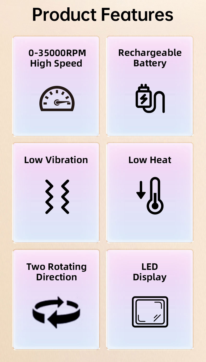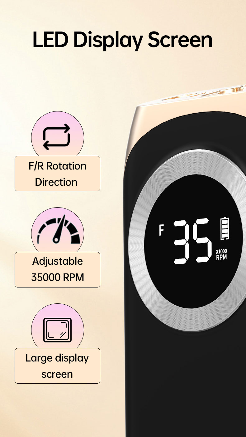 1:Large LED display showing working mode,battery,ect.35 working SPEEDS & 2 ROTATIONS