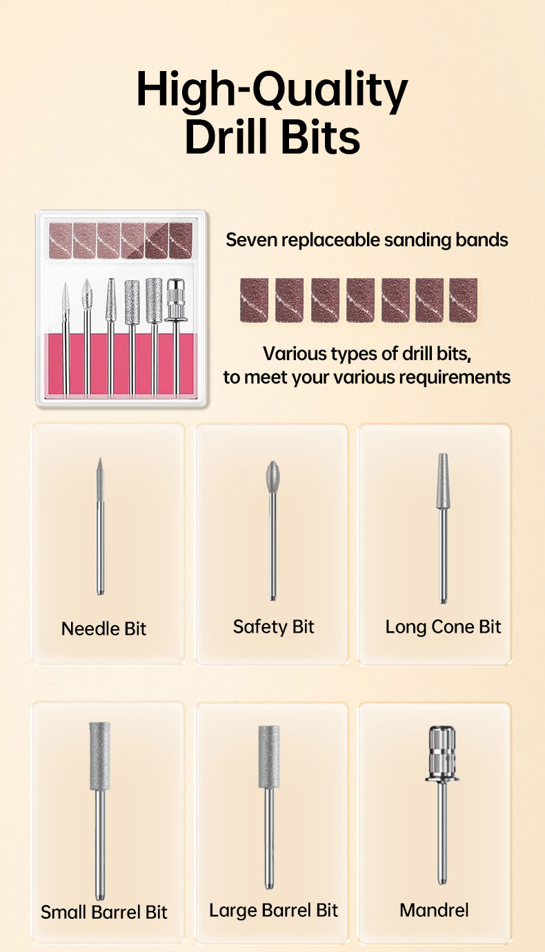 Light Weight Handpiece: Made of the special material, aluminum alloy. Ample ventilation holes are designed for dissipating the heat effectively. Do your nail smoothly and enjoy the feeling of low vibration. It will not let your hand be numb after long-term use. Pencil-shape and lightweight design are perfect for extended use. (works with all kinds of 3/32” shank bits).