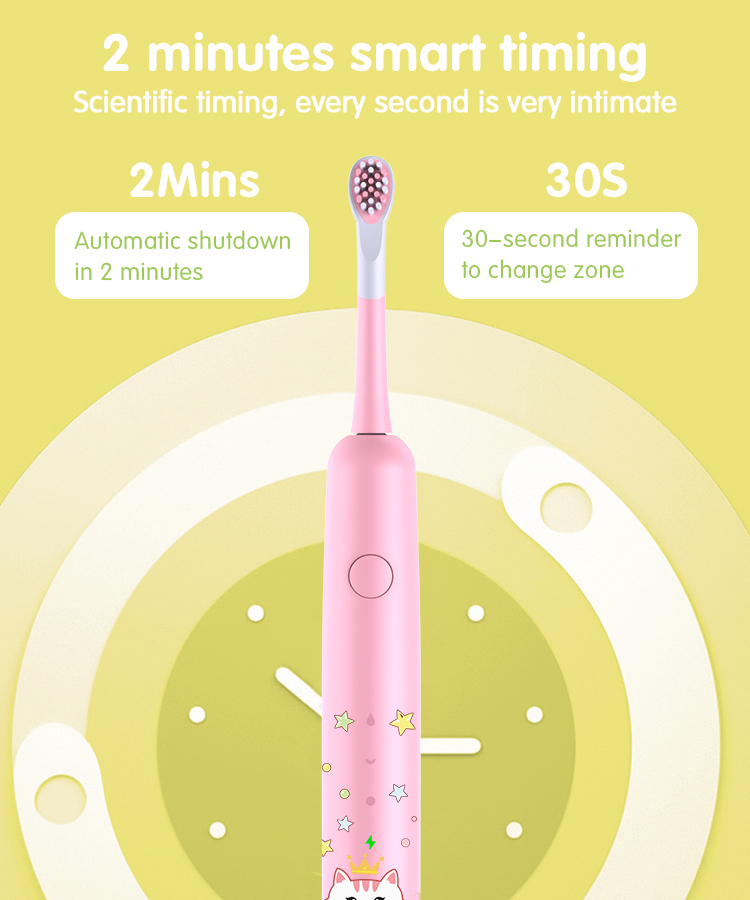 - AUTOMĀTISKAIS TAIMERIS: šai elektroniskajai zobu birstei ir iebūvēts 2 minūšu viedais taimeris, kas mudina jūsu bērnu tīrīt zobus ilgāku laiku, attīsta labus zobu tīrīšanas paradumus un samazina zobu bojāšanos.