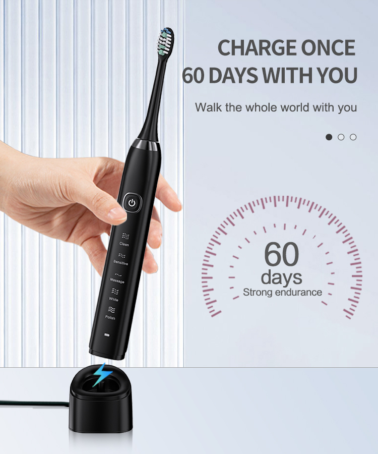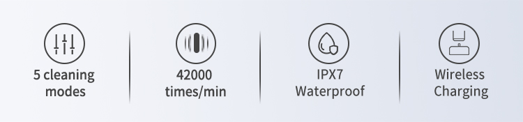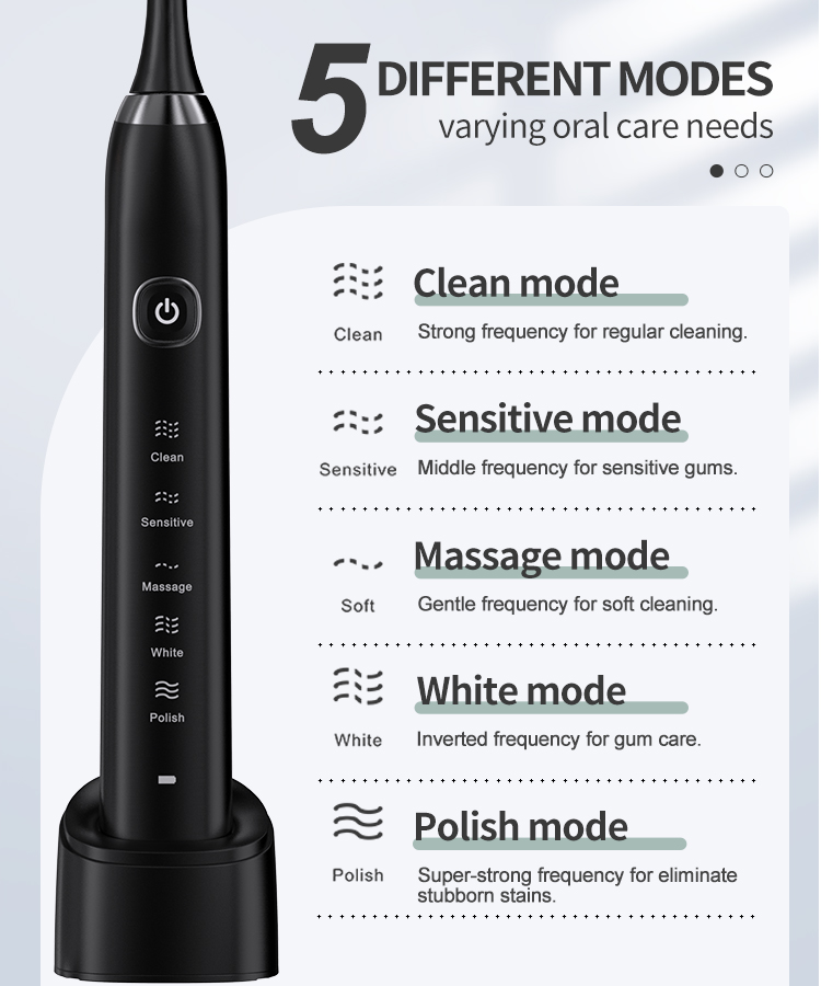 - 5 AUGSTAS VEIKTSPĒJAS TĪRĪŠANAS REŽĪMI - tīra (maiga), balta (spēcīga), pulēšana (spēcīga invertēšanas frekvence), maigāka (maiga apgrieztā frekvence) un jutīga (mīksta), lai atbilstu dažādiem smaganu zobu apstākļiem, lai jūs varētu izvēlēties dažādus režīmus. atbilstoši jūsu vēlmēm un zobārsta ieteikumiem.