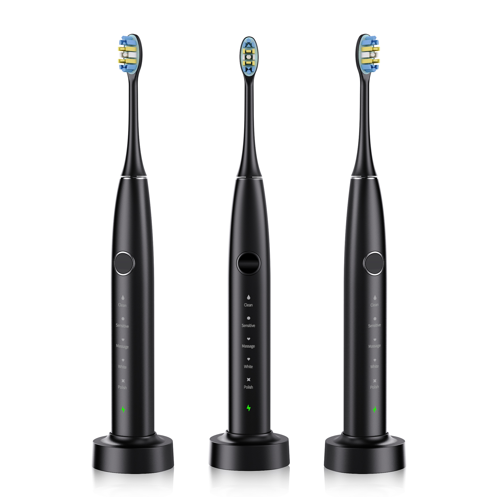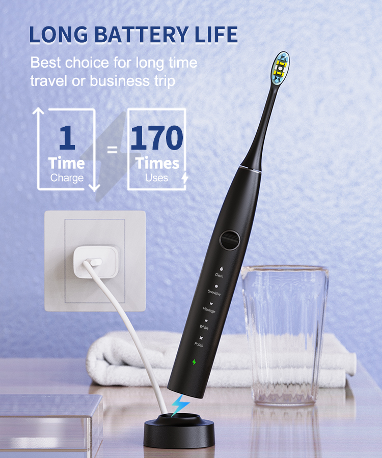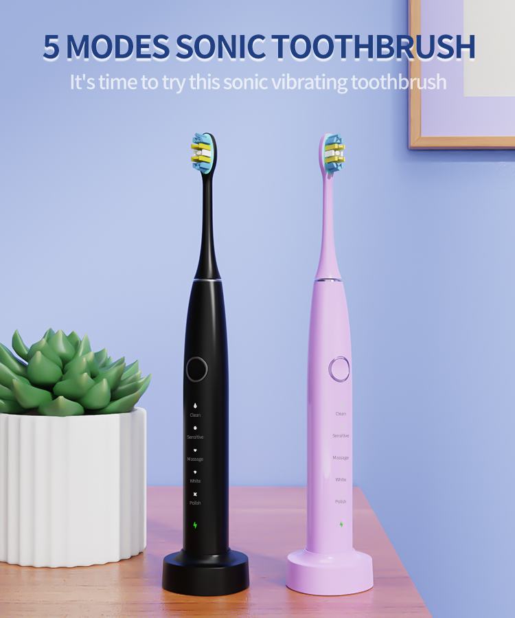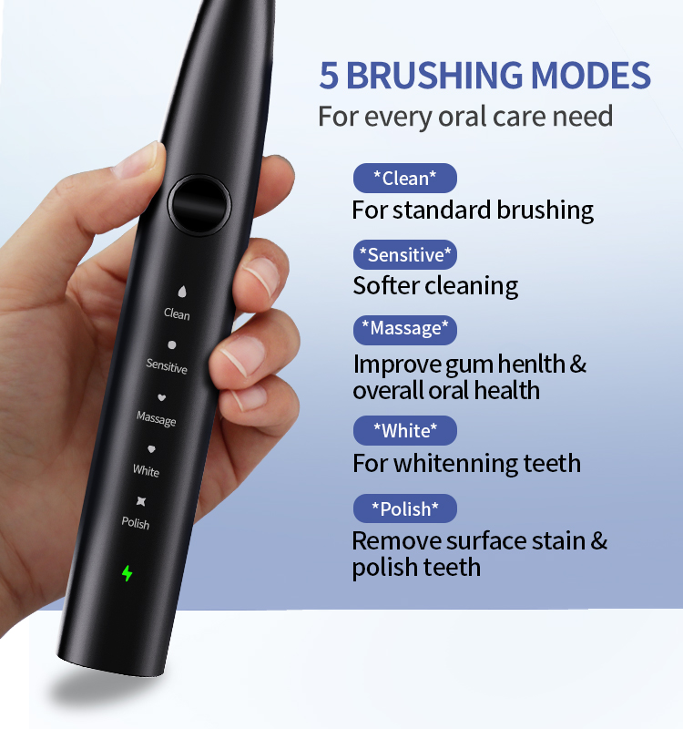 - 5 AUGSTAS VEIKTSPĒJAS TĪRĪŠANAS REŽĪMI - tīra (maiga), balta (spēcīga), pulēšana (spēcīga invertēšanas frekvence), maigāka (maiga apgrieztā frekvence) un jutīga (mīksta), lai atbilstu dažādiem smaganu zobu apstākļiem, lai jūs varētu izvēlēties dažādus režīmus. atbilstoši jūsu vēlmēm un zobārsta ieteikumiem.
