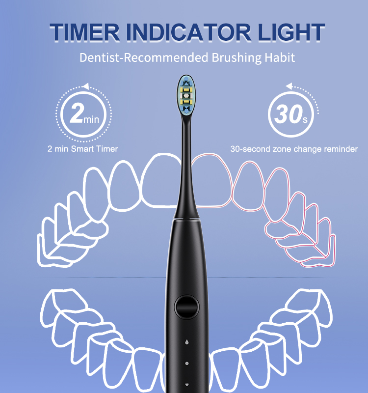- VIEDĀ VIBRĀCIJAS PAZIŅOJUMA TAIMERIS - Iebūvēta viedā taimera vadība, 30 sekunžu intervāls, kas atgādina jums pāriet uz nākamo mutes kvadrantu, un pilnībā 2 minūtēs (4 kvadranti), ko ļoti iesaka profesionāli zobārsti kā pareizu zobu tīrīšanas veidu.
